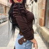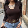 Camiseta canalé en tono marrón chocolate, entallada y manga abullonada.