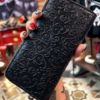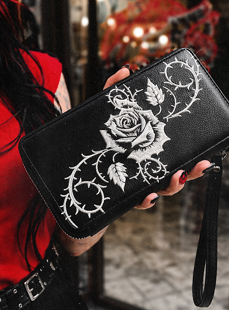 20x10cm aprox. Tiene compartimentos para tarjetas, billetes y monedas (con cremallera).