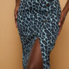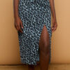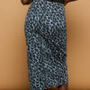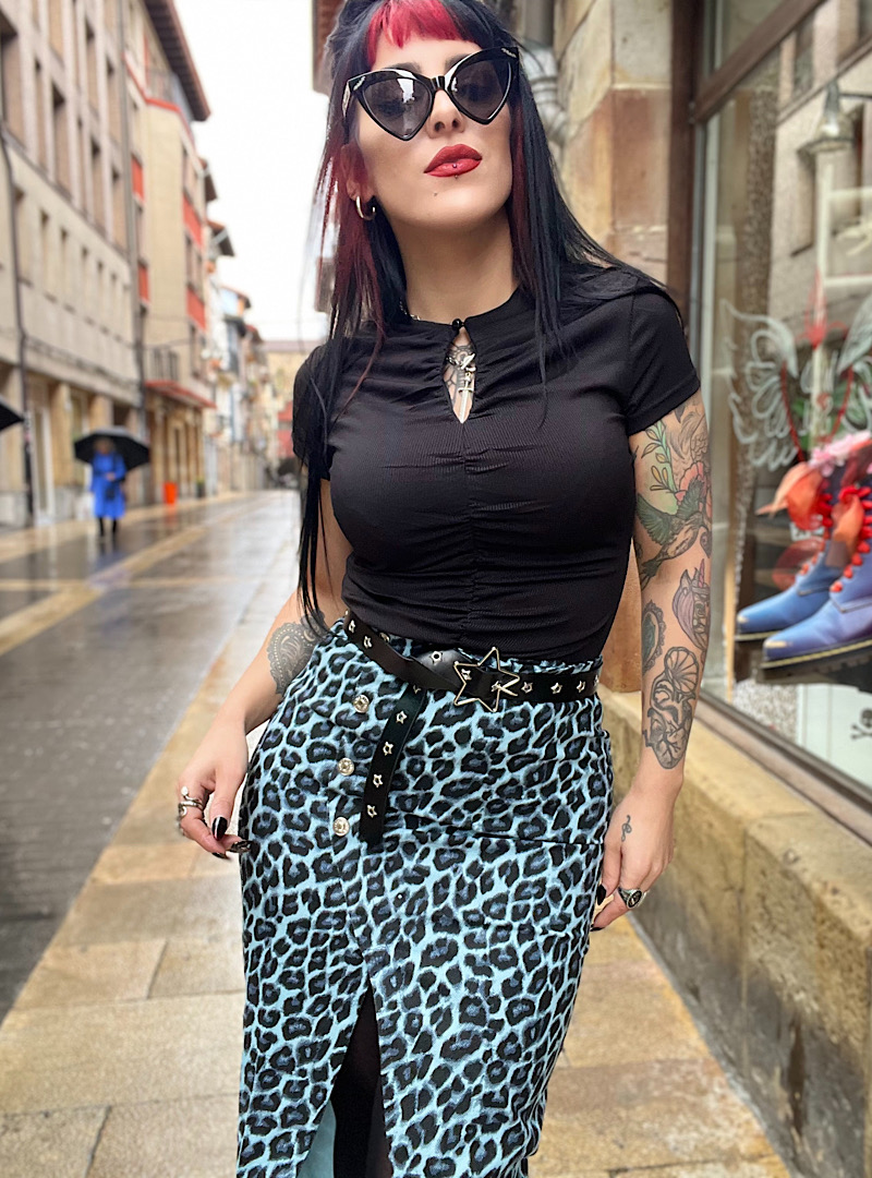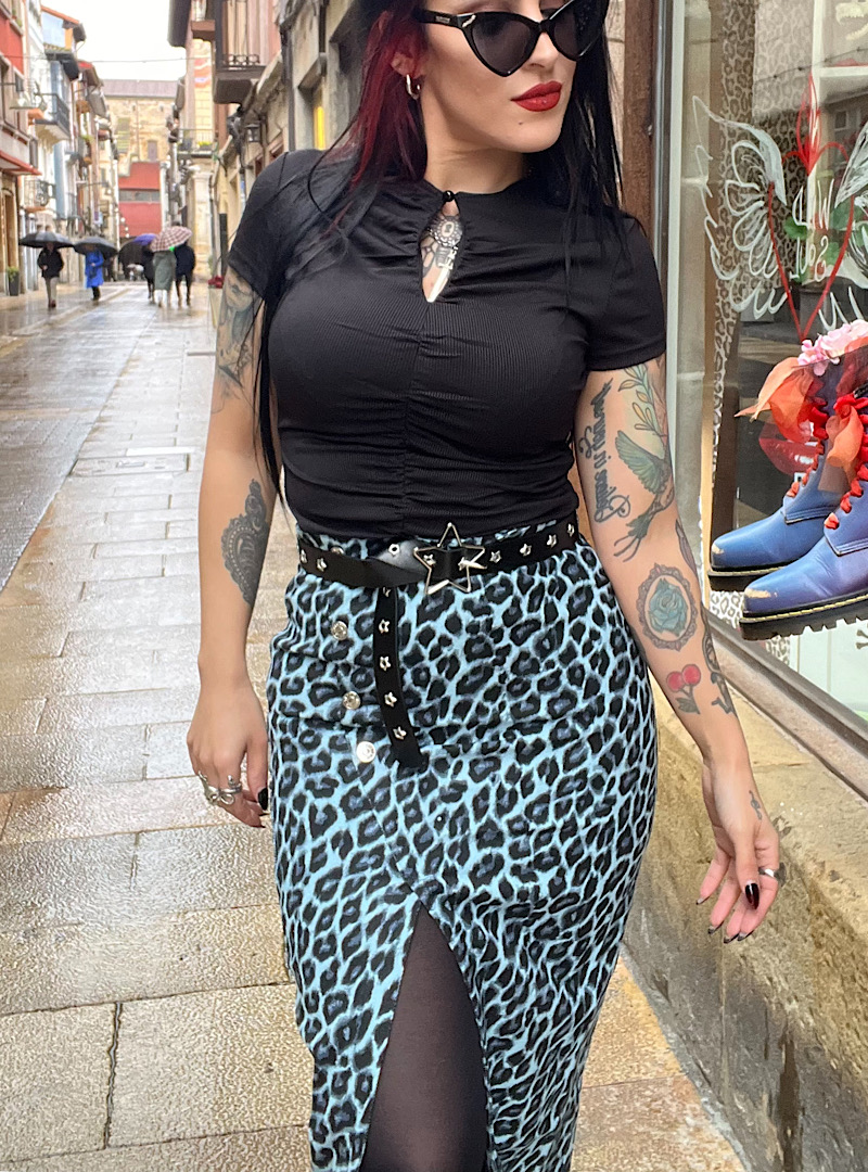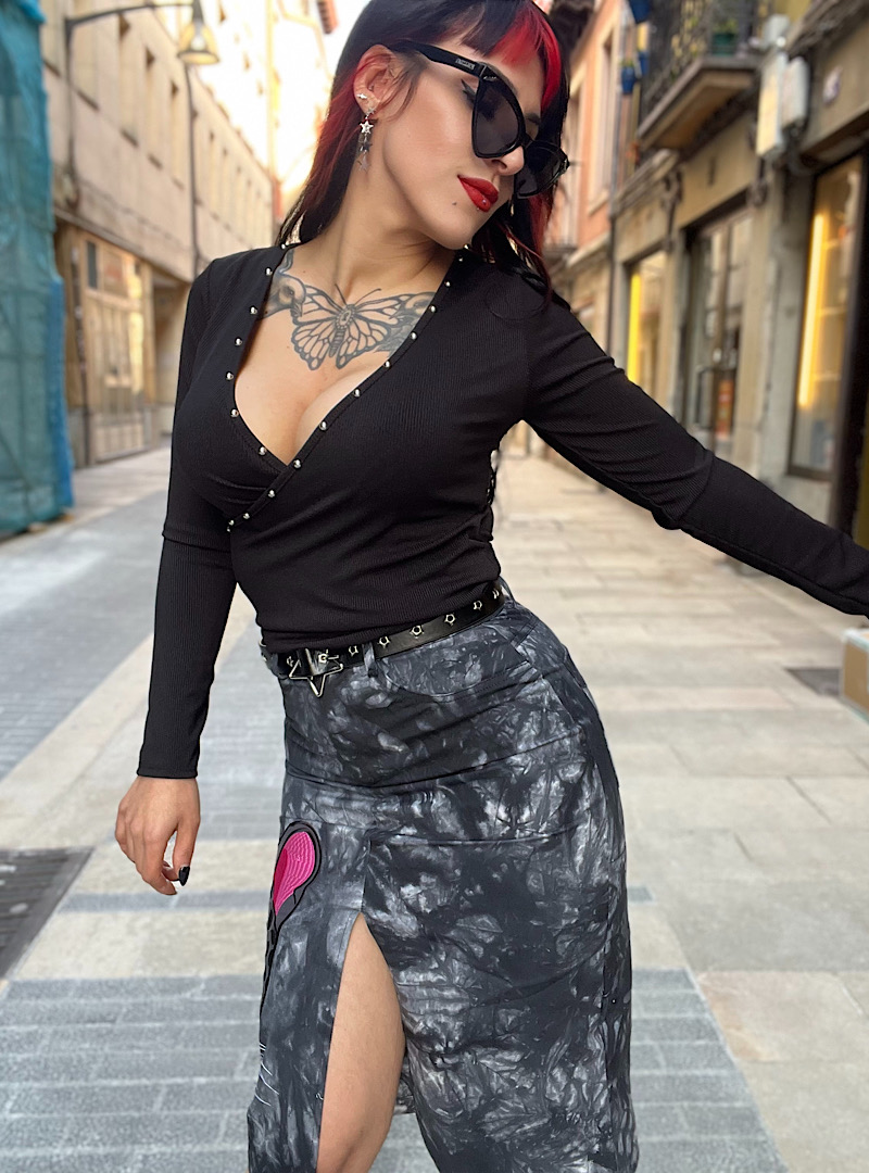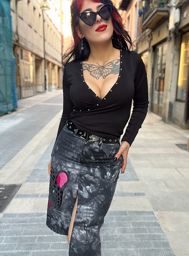 Falda vaquera con cremallera lateral y botines a un lado plateados decorativo. Lleva abertura a un lado y la largura es midi.