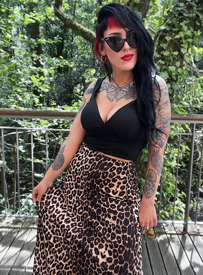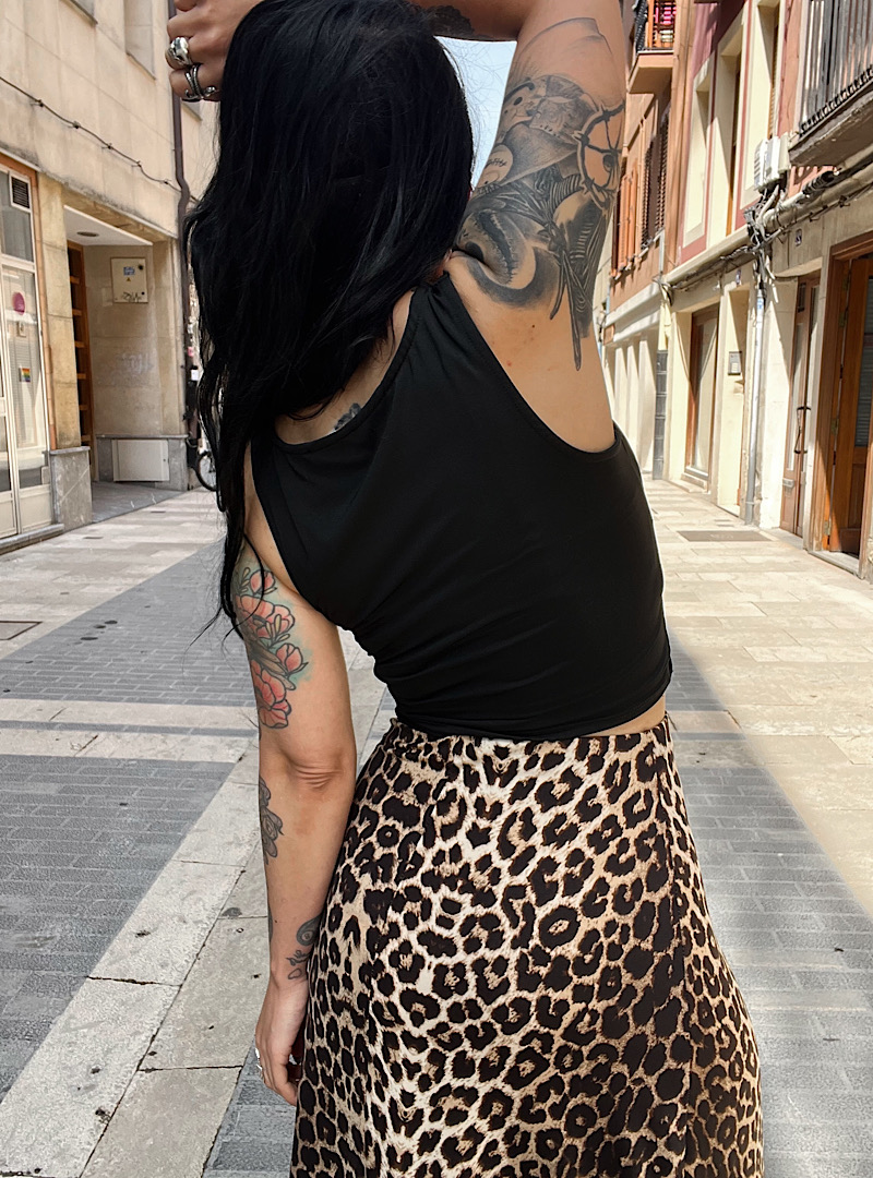 Falda evasé total print. Es muy elástica y largura hasta los tobillos más o menos. Depende de la altura.