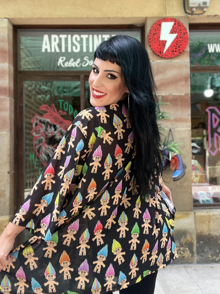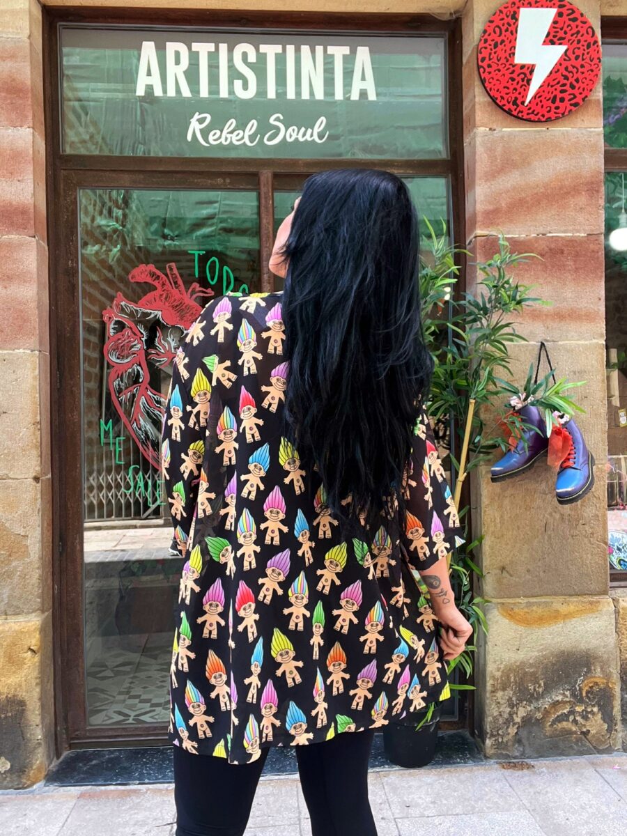 Atrévete a destacar con este kimono de estampado retro pop lleno de personalidad. Ligero, cómodo y con un diseño que no pasa desapercibido.