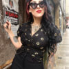 Este top negro con estampado solar dorado combina sofisticación y frescura en una sola pieza. Su escote en “V” estiliza el pecho y realza la silueta, mientras el detalle fruncido aporta un toque femenino y favorecedor.