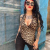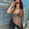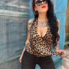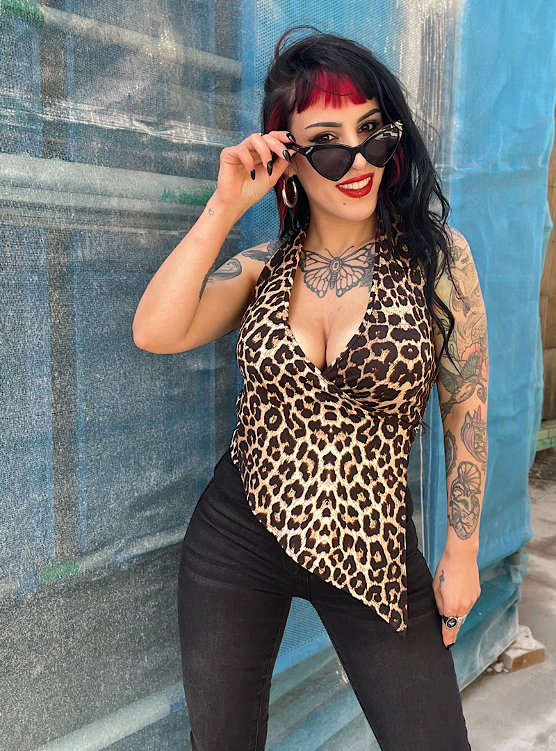 Top con escote y muy elástico. Corte halter. Lleva una capa superpuesta asimétrica.