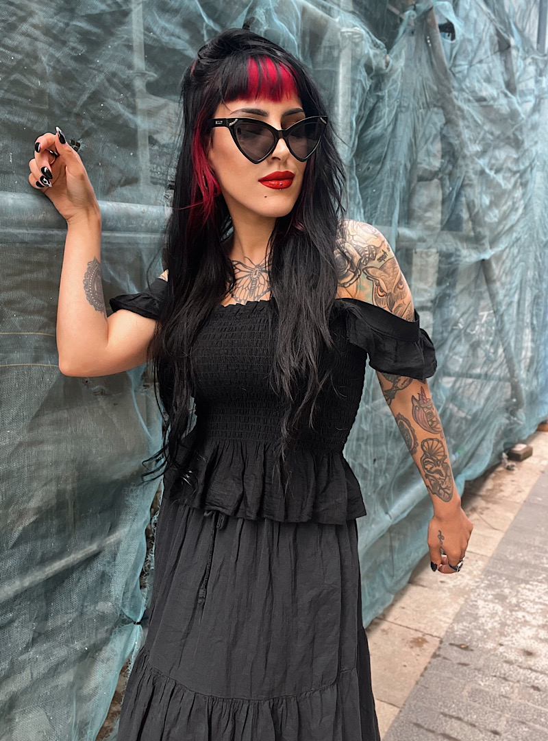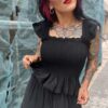 Top elástico con tirante volante. Cuerpo en nido de abeja y peplum.
