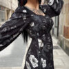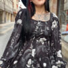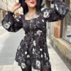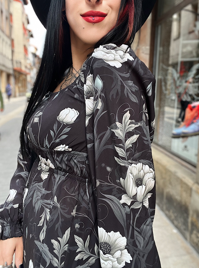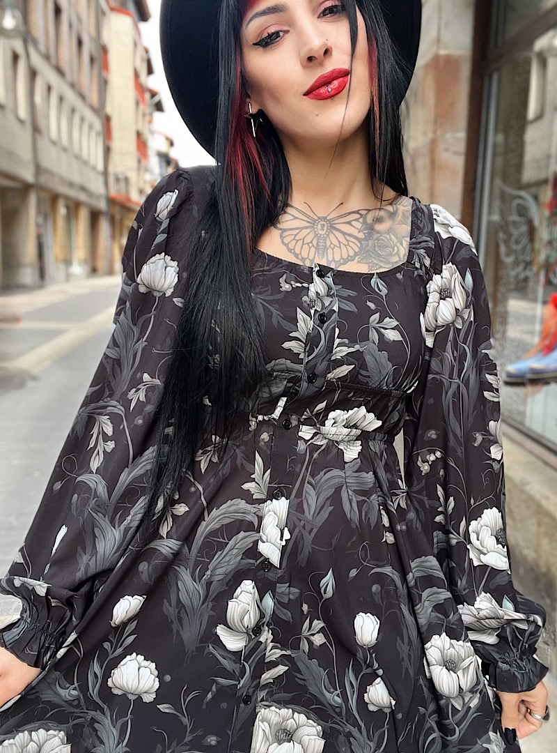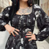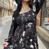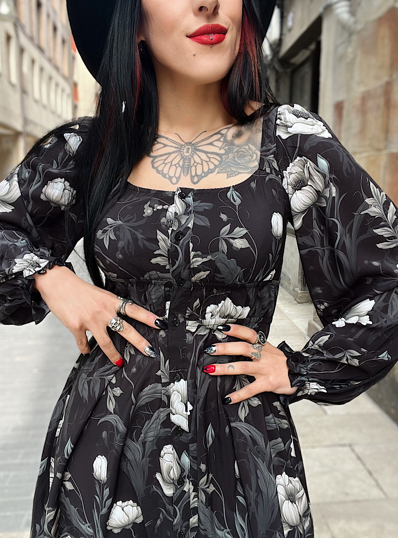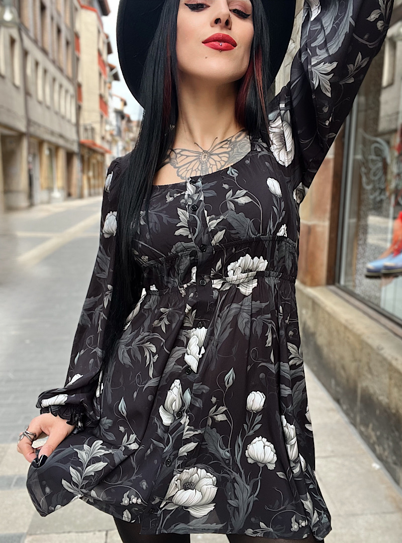 Vestido boho dark cortito con manga abullonada, ajuste al pecho y totalmente suelto a la cadera. Precioso!!!