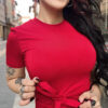 Vestido entallado de largo midi con cuello redondo y manga corta. Incorpora un lazo lateral que define la cintura y estiliza la silueta. Confeccionado en tejido elástico cómodo y adaptable. Un básico elegante y versátil para cualquier ocasión.