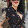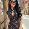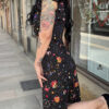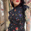 Vestido negro midi camisero de cuello mao y manga sisa con volantes. Estampado multicolor de motivos astrológicos. Ajustado a cintura. Falda corte evasé.